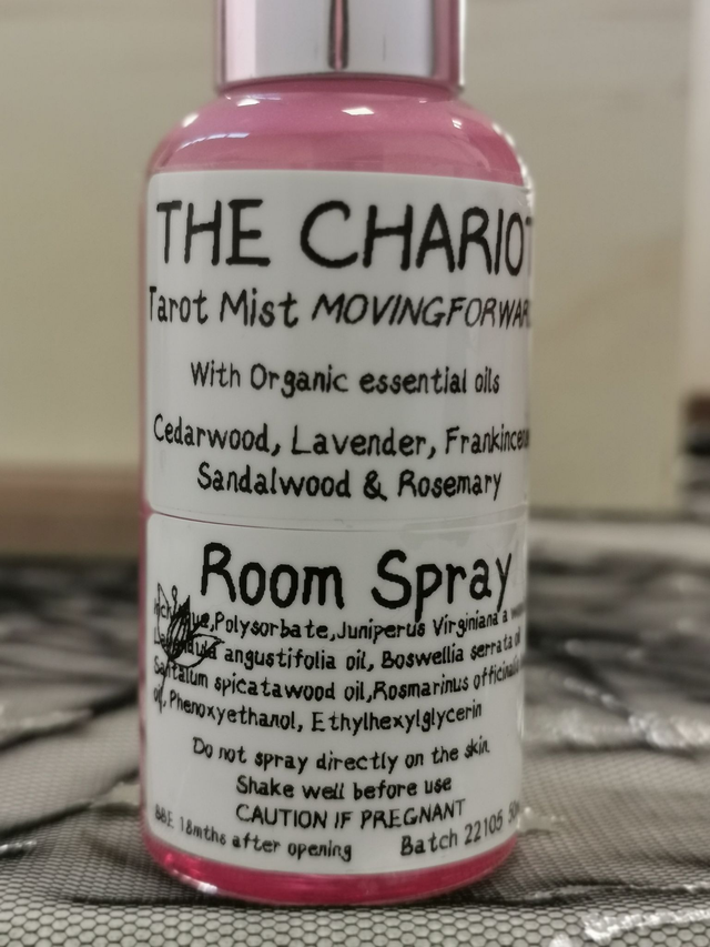 This woody and fresh scent contains organic essential oils, Cedarwood, Lavender, Frankincense, Sandalwood and Rosemary. The above oils are chosen for their following qualities: boosting self confidence and self expression, to help focus scattered thoughts, to support indecisiveness and help balance mind with emotions. These qualities reflect the Major Arcana card of "The Chariot."