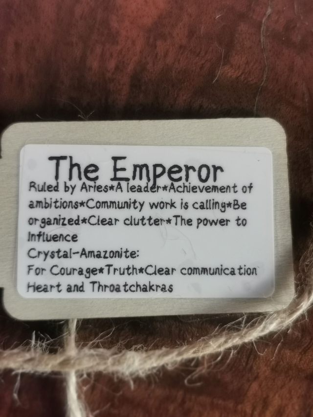 This earthy and sweet scent contains organic essential oils, Cedarwood, Frankincense, Rose geranium and sweet orange. The above oils are chosen for their following qualities: to help boost strength, dicipline and composure, to help optimize courage and manifestations and help to relax rigidity and an overanalytical mind These qualities reflect the Major Arcana card of "The Emperor." I have also included the crystal-Amazonite, to help support the qualities of this card.