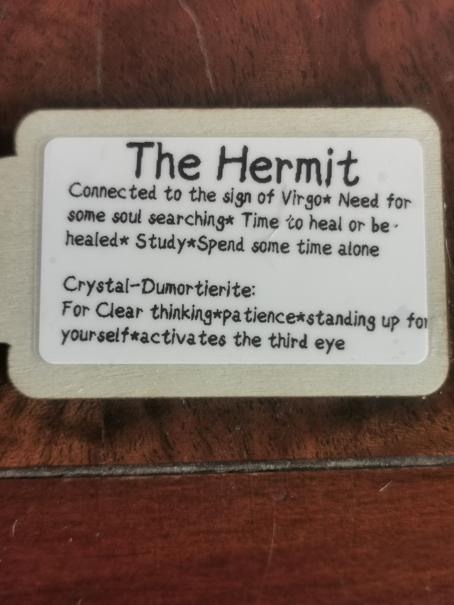 This deep,woody and soothing scent contains organic essential oils, Cedarwood, Cypress, Melissa and Benzoin. The above oils are chosen for their following qualities: Balancing, encouraging quiet time, emotional comfort particularly towards feelings of loneliness and calming over sensitive people. These qualities reflect the Major Arcana card of "The Hermit."I have also included the crystal-Dumortierite, to help support the qualities of this card.