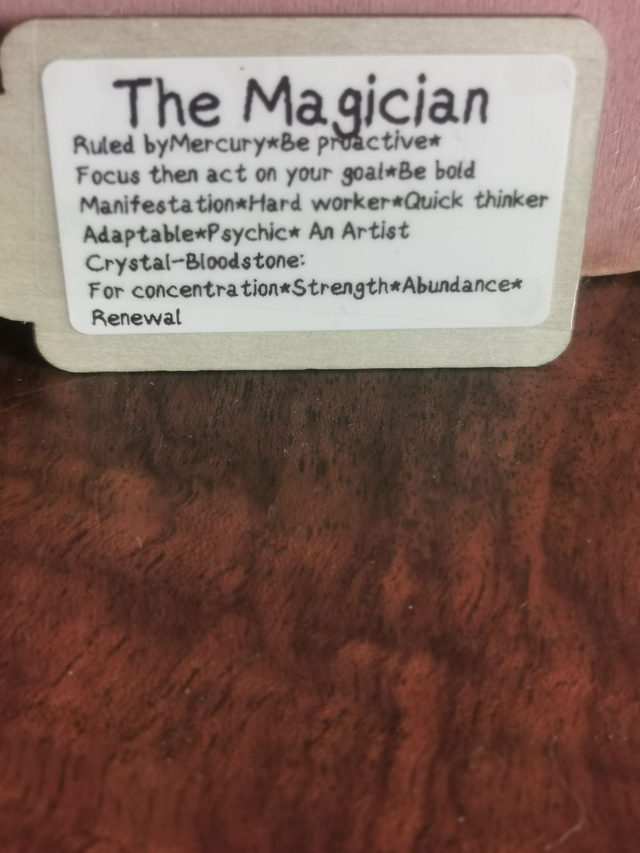 This uplifting and floral scent contains organic essential oils, Frankincense,Rose Geranium, Jasmine, Ylang Ylang and Lemon.The above oils are chosen for their following qualities: boosting focus and self confidence, optimizing courage, helping to connect to one's highest intentions and for new beginnings. These qualities reflect the Major Arcana card of "The Magician." I have also selected the crystal- Dragon's Bloodstone, to further support the qualities of this card.