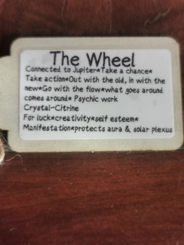 This floral, deep, soft scent contains organic essential oils,Lavender, Sandalwood and Rose Geranium. The above oils are chosen for their following qualities: balancing to the mind and emotions, protection, calming anxieties. These qualities reflect the Major Arcana card of "The Wheel." I have also selected the crystal-Citrine, to further endorse the qualities of this card.