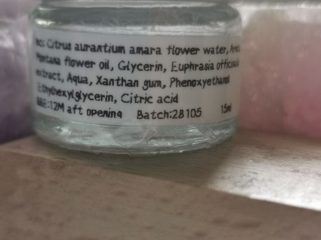 Containing only 5 ingredients, including organic Eyebright and Arnica oil, this gel is in a base of Neroli hydrolat. The scent is delicate and floral.